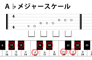 次はA♭メジャースケールです。『B(シ)』と『E(ミ)』と『A(ラ)』と『D(レ)』がフラットしています。