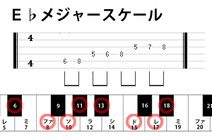 次はE♭メジャースケールです。『B(シ)』と『E(ミ)』と『A(ラ)』がフラットしています。