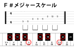 それでは、先ほど説明しました、G♭と言葉は違えど音は同じというF#のメジャースケールを見てみましょう。