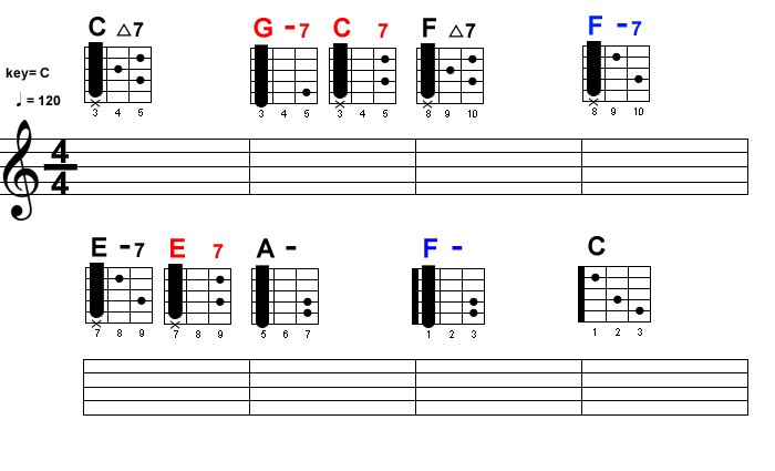 そしてこちらがKey=Cのコード進行の中にノンダイアトニックコードを混ぜたコード進行です。まずは実際に弾いてみて、体で感じてみてください。