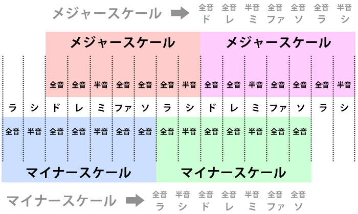 このように、メジャースケールとマイナースケールは、スタートする音が違うだけで、使っている音はまったく同じなのです。