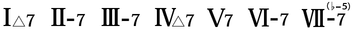 ▼Ⅴ-7 ⇒ Ⅰ7 ⇒ Ⅳ△7 の、Ⅴ-7を省略した2次ドミナント進行※次章で説明しますが、F-7 は『サブドミナントマイナー』というものです