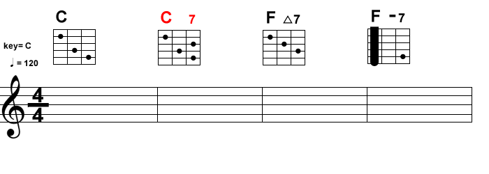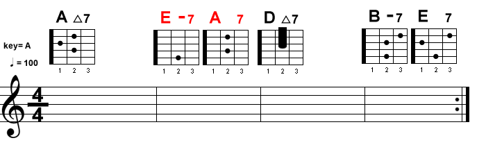 1度(ワン)のコードで感じる終止感が薄くなって、フンワリとした印象になります。では実際に弾いてみましょう。