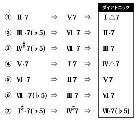 なので、ツーファイブワンは Ⅱ-7(♭5) ⇒ Ⅴ-7 ⇒ Ⅰ-7 と、思われるかと思います。