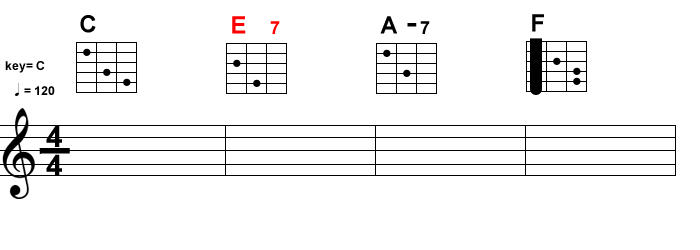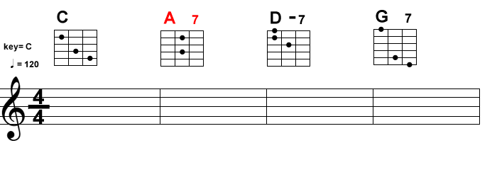 何はともあれ、まずは二次ドミナントを実際に体感してみましょう。赤文字のコードが二次ドミナントです。
