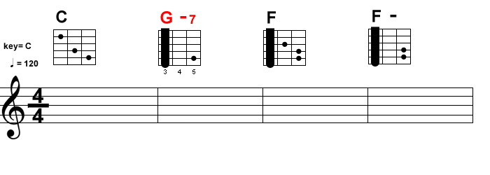 ▼ 通常の2次ドミナントの場合、G-7(Ⅱ) ⇒ C7(Ⅴ) F(Ⅰ) となりますが、今回はこのC7(Ⅴ)を省略しました