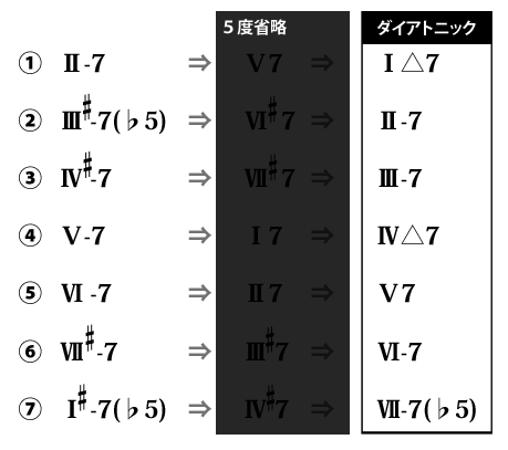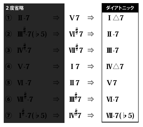 このように、2次ドミナントでは以下の表のように、Ⅱ(ツー) ⇒ Ⅴ(ファイブ) ⇒ Ⅰ(ワン)の、Ⅱ もしくは Ⅴを省略する事ができます。
