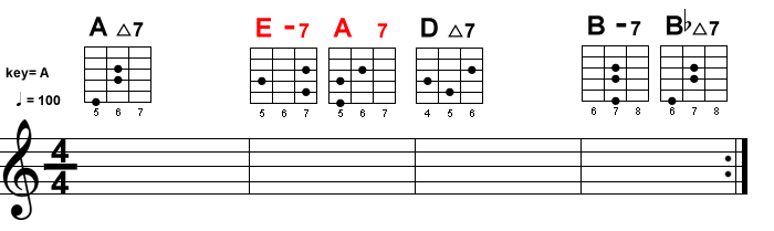 E-7 ⇒ A7 の部分は、一瞬Key=D になるものの、D△7 で、またKey=A に帰ってきます。