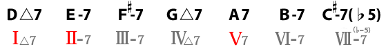 次に、E-7 ⇒ A7 ⇒ D△7 、これは、Key=Dのツーファイブワンです。