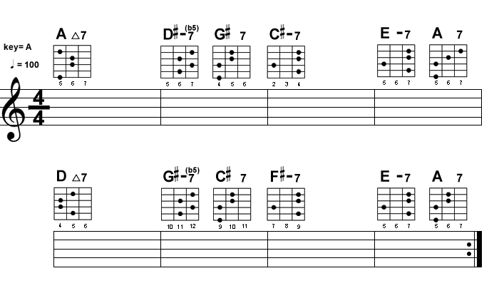 この調子で、2次ドミナント、2度省略のコード進行を、いくつか弾いてみましょう。