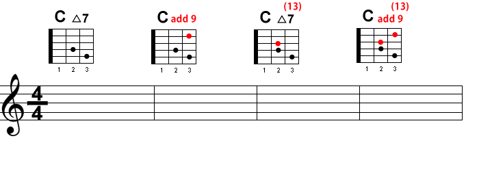 まず、普通の C△7 ですね。ではこれに、9度の音である『レ』の音を足してみましょう。それが2番目の C add9(Cアドナインス)です